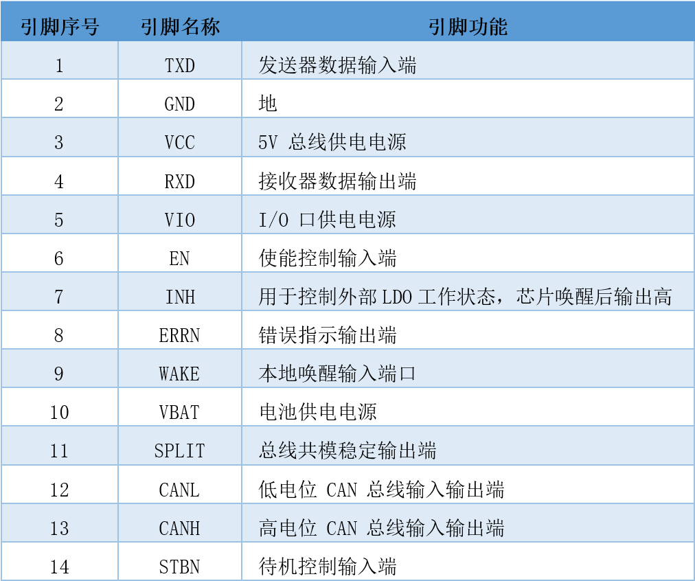采用5V主供電VCC,VBAT輔助睡眠供電,支持IO口3.3V/5V 微處理器(MCU)直連,支持車載12V或 24V電源系統(tǒng)。