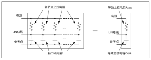 RC時(shí)間常數(shù)中R為總線上所有節(jié)點(diǎn)上拉電阻并聯(lián)的總阻值R總線,C為總線上所有的主從節(jié)點(diǎn)并聯(lián)電容及總的線電容之和即C總線 ,這個(gè)值限定在(1~10nF);如下: